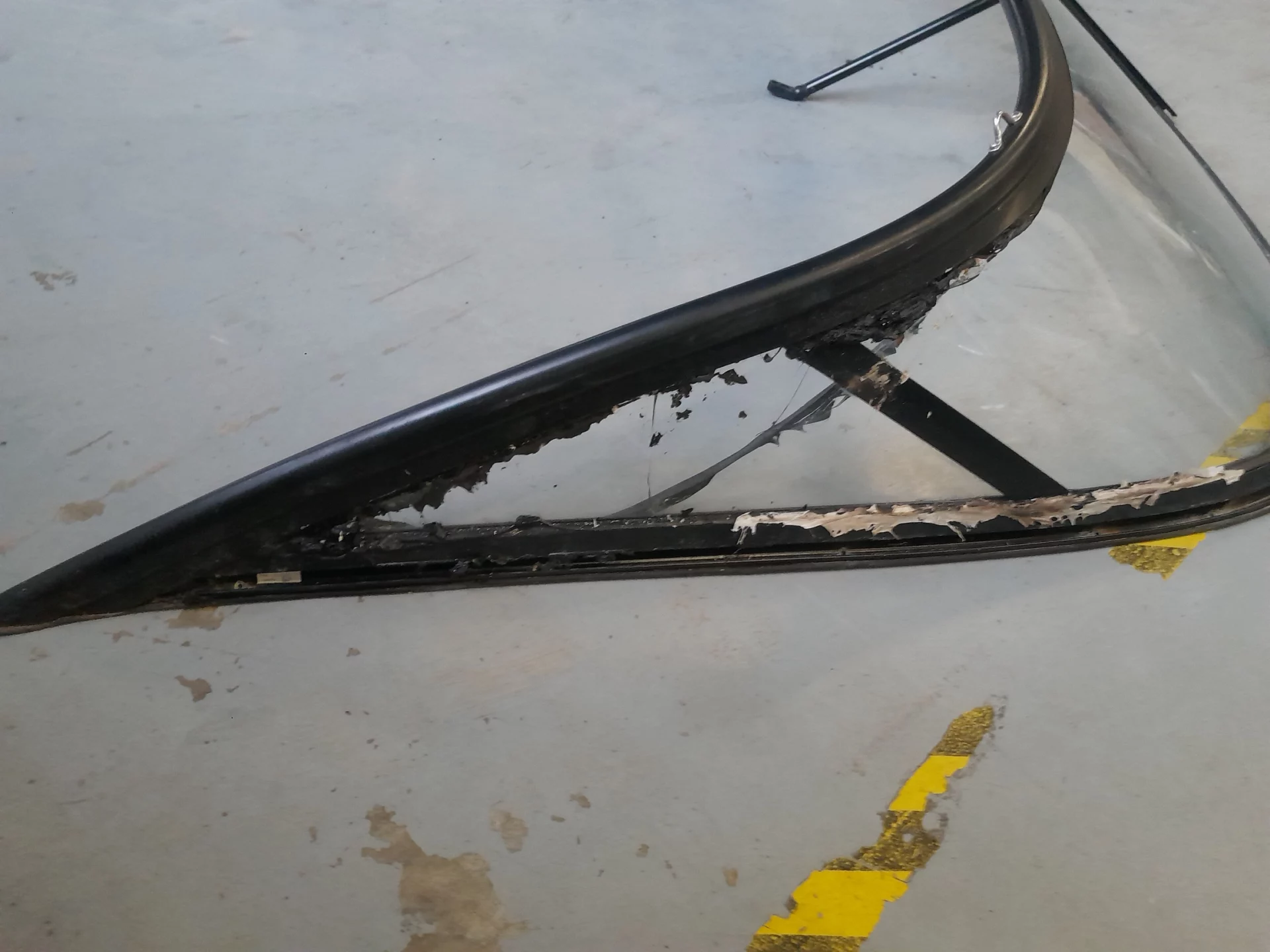 Partie tribord avec joints de fixation de vitre fondue, vitre pas endommagée.